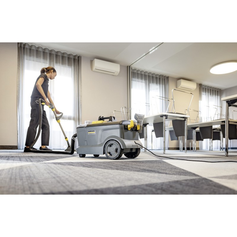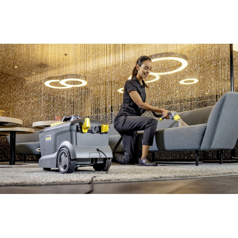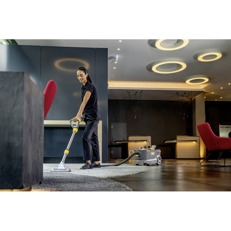Profesionalni Kärcherov čistač s raspršivačem Puzzi 10/1 pruža izvrsnu usisnu snagu, kao i higijenske rezultate čišćenja i osigurava da se tekstilne površine mogu brzo ponovno koristiti. U tu svrhu, stroj za ekstrakciju raspršivačem raspršuje otopinu za čišćenje duboko u tekstilna vlakna, zatim je ponovno uklanja s izbačenom prljavštinom, što ga čini savršenim za čišćenje presvlaka, tepiha i drugih tekstilnih površina. Robustan, kompaktan dizajn Puzzija 10/1 osigurava dug životni vijek, a time i visoku isplativost – idealno za građevinske usluge, hotelski i ugostiteljski sektor ili za čišćenje unutrašnjosti vozila. Poklopac uređaja, mlaznica za presvlake i mlaznica za pod prozirni su za bolji pregled prljave vode. Veliki gumbi kojima se može upravljati rukom ili nogom također povećavaju udobnost za korisnika. Uz to, stroj dolazi s integriranom kukom za kabel i pričvršćivačem za mlaznicu za presvlake i usisnu cijev.