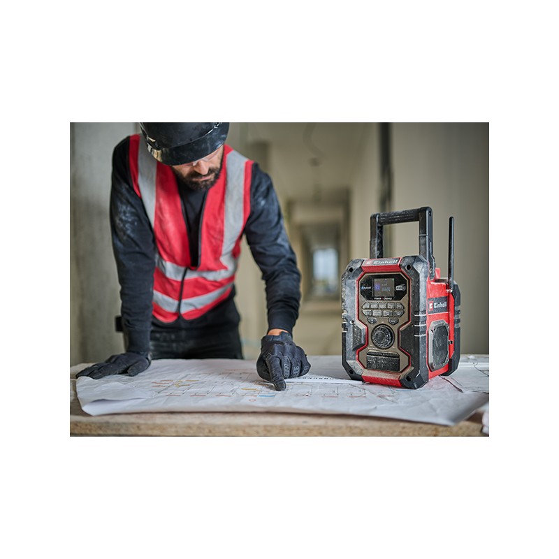 Uz Bluetooth povezivanje dometa do 10 m u zatvorenom i do 20 m na otvorenom, lako reproduciraš glazbu s pametnog telefona ili tableta. Radio je opremljen s dva snažna zvučnika snage 10 W koji osiguravaju bogat i jasan zvuk. Kompaktni dizajn i robustna konstrukcija čine ga idealnim izborom za radionicu, dvorište ili gradilište.
