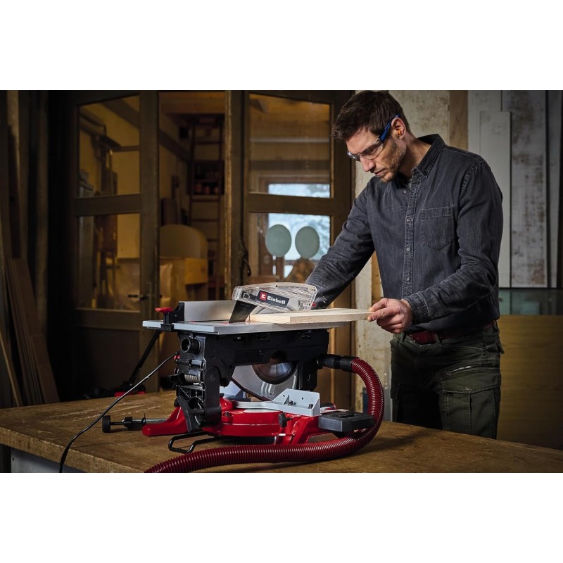Einhell kombinirana kružna pila TE-MS 254 T snažan je i svestran alat u radionici ili hobi podrumu. S izlaznom snagom od 2000 W i brzinom praznog hoda od 5000 okr/min, djeluje snažno i precizno kroz materijale kao što su drvo, obloženi paneli ili plastika. Visokokvalitetni list pile Ø 254 mm s karbidnim vrhom sa svojih 36 zuba čisto i precizno reže radne komade. Najveća dubina rezanja s postavkom od 90° x 90° (stol pile x glava pile) je 74 mm kao preklopna pila, a najveća širina rezanja je 130 mm. Kombinirana kružna pila može se pretvoriti u stolnu kružnu pilu i fiksirati jednostavno i bez dodatnog alata. U ovom slučaju, podesivi graničnik osigurava ravne rezove. Okretna ploča se može podesiti lijevo i desno pod kutom do 45° - kutna skala pomaže u optimalnom položaju. Za postizanje savršenog zakošenja, glava pile se može nagnuti do 45° ulijevo. Integrirani laser za rezanje označava rez. S lijeve i desne strane nalazi se oslonac za radni komad, tako da se duži radni komadi mogu lakše obraditi. Stezni uređaj nudi dodatnu sigurnost, s kojom se radni materijali mogu fiksirati. Integrirani usisni priključci Ø 36 mm, na koje se mogu spojiti svi Einhell usisavači suho/mokro.