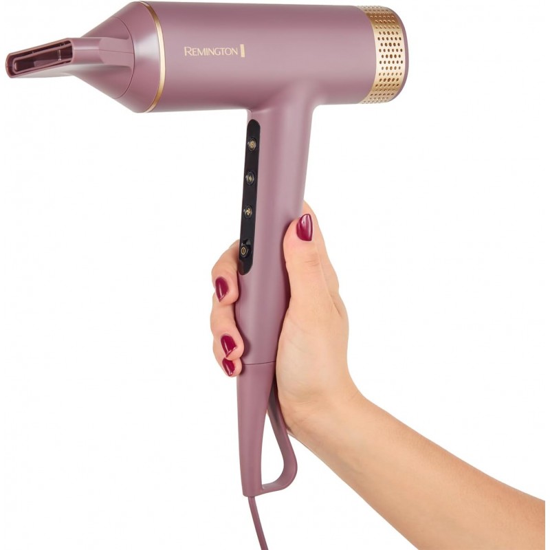 Postignite mekoću kose bez stršećih vlasi - koju ćete obožavati, uz digitalno sušilo za kosu REMINGTON® AIRvive™. Sušilo primjenjuje Ionic Air tehnologiju iznimne brzine koja eliminira statički elektricitet i brzo suši kosu bez ekstremne štetne topline, dok istovremeno na vašu kosu otpušta mikro regenerator koji se aktivira toplinom zraka kako biste imali cjelodnevnu zaštitu od stršećih vlasi¹. Napredni digitalni motor okreće se 5 x brže² kako bi stvorio veliku brzinu zraka i brzo posušio čak i najdužu i najgušću kosu. Osim što je ultra brzo, ovo sušilo je i ultra nježno. Zaštitni toplinski senzor regulira temperaturu zraka kako bi zaštitio kosu od iznimne topline, dok je postavka Comfort+™ nježna prema tjemenu i pomaže spriječiti nelagodno sakupljanje vrućeg zraka tijekom sušenja. Magnetski tanki koncentrator za sušenje kose i difuzor za definiranje kovrči se rotiraju za 360°, čime omogućavaju precizno oblikovanje kose, a 12 kombinacija topline i brzine puhanja zraka omogućuju oblikovanje svake vrste kose. Ovo sušilo ima dizajn u obliku slova "T", 15 % je manje³ i 30 % lakše³. Njegova akustika je optimizirana, a ekstra dugačak strujni kabel omogućuje lagano i ugodno rukovanje.