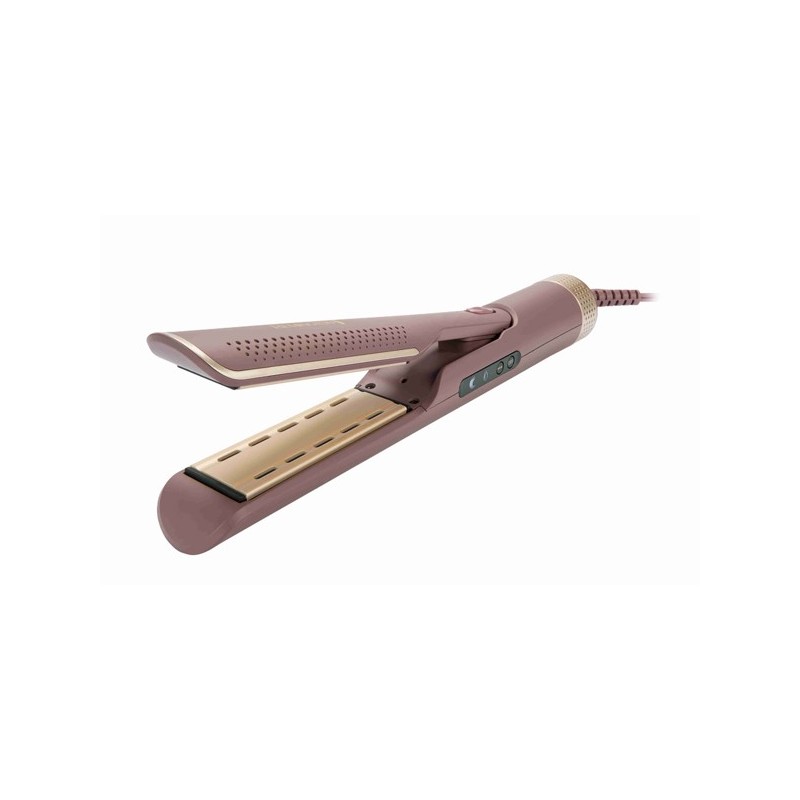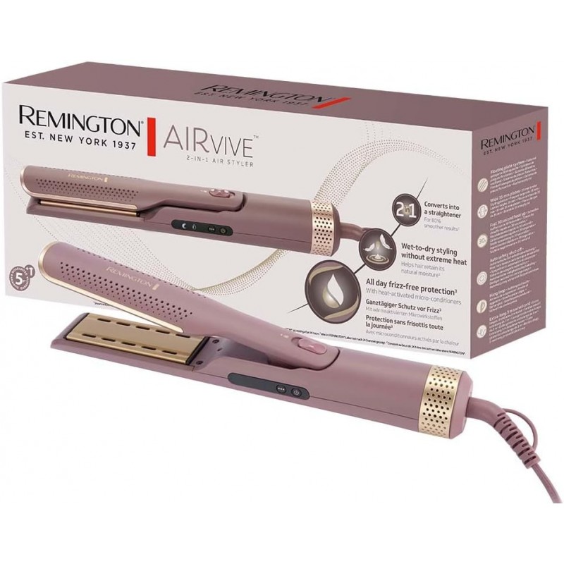 Postani šaptačica stršećim vlasima uz REMINGTON® AIRvive™ 2-in-1 Air Styler. Napravljen kako bi bio nemilosrdan prema stršećim vlasima, no nježan prema Vašoj kosi, ovaj svestrani uređaj za oblikovanje kose 2-u-1 će izokrenuti Vašu rutinu zauvijek. Uz dva načina oblikovanja, možete ga koristiti za sušenje i ravnanje vlažne kose, kao i za ravnanje i oblikovanje suhe kose. U mokrom načinu rada, koncentrirani mlaz toplog zraka s grijaćim pločama na niskoj temperaturi rada, suši i zaglađuje Vašu kosu bez upotrebe ekstremnih temperatura koje oštećuju kosu. To pomaže u zadržavanju prirodne vlage vaše kose do 24h¹, pružajući osjećaj iznimne mekoće. Prebacite u način rada za završno oblikovanje kako biste smanjili protok zraka i pojačali temperaturu grijaćih ploča te tako izravnali tvrdoglave pramenove ili osvježili frizuru između pranja kose. Ionizirani zrak pomaže ukloniti statički elektricitet i trenutačno hladi Vašu kosu tijekom oblikovanja, kako biste kreirali frizure koje ostaju na mjestu i koje su 80 % glađe². Ultra glatke grijaće ploče s 10 x više keramike⁴ pobrinut će se da uređaj glatko klizi preko Vaše kose, dok istovremeno na Vašu kosu ispušta mikro regenerator, koji se aktivira toplinom, za cjelodnevnu zaštitu od stršećih vlasi³. A ne morate samo ravnati kosu - kućište ovog uređaja se aktivno hladi, što znači da možete eksperimentirati i s elastičnim kovrčama, uvojcima ili valovitom kosom, uz veću kontrolu.