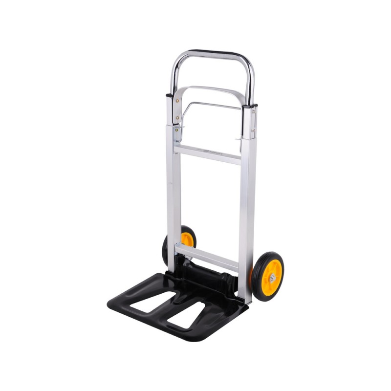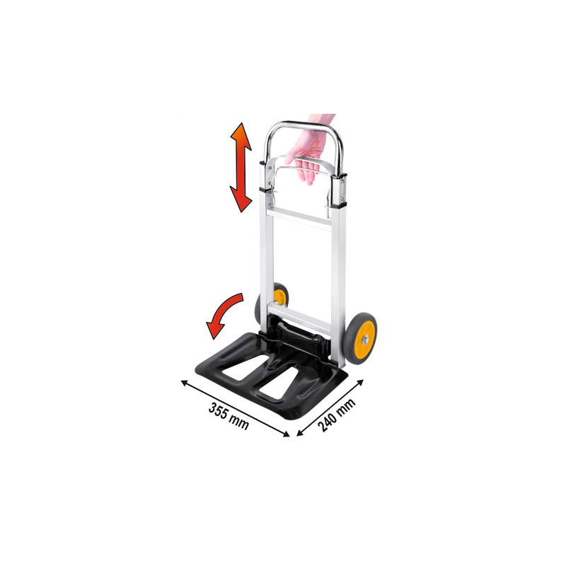 Sklopiva transportna kolica nosivosti 90 kg. Velika čelična utovarna ploča dimenzija 355x240 mm omogućuje utovar kartona, kutija ili spremnika različitih veličina. Zahvaljujući sustavu brzog sklapanja, utovarna ploča se sklapa jednim pokretom. Teleskopska ručka sa sustavom zaključavanja nakon rasklapanja doseže ukupnu duljinu od 1080 mm, što omogućuje ergonomski transport bez pretjeranog napora. Osim toga, ugrađena stabilna prečka znatno olakšava podizanje tereta. Važna prednost ovih kolica je njihov kompaktan dizajn. Kada su sklopljena, mjere 190x710x390 mm. Zbog toga su vrlo jednostavna za skladištenje ili transport, lako se uklapaju u prtljažnik bilo kojeg osobnog automobila. Kotači izrađeni od PP + EVA promjera 150 mm otporni su na habanje. A lagana aluminijska konstrukcija, težine samo 4,3 kg, osigurava dugotrajnu upotrebu. Podaci: - nosivost do 90 kg - teretna ploča 355x240 mm - sustav brzog sklapanja - teleskopska ručka - kompaktan dizajn (staje u prtljažnik bilo kojeg osobnog automobila) - lagana aluminijska konstrukcija.