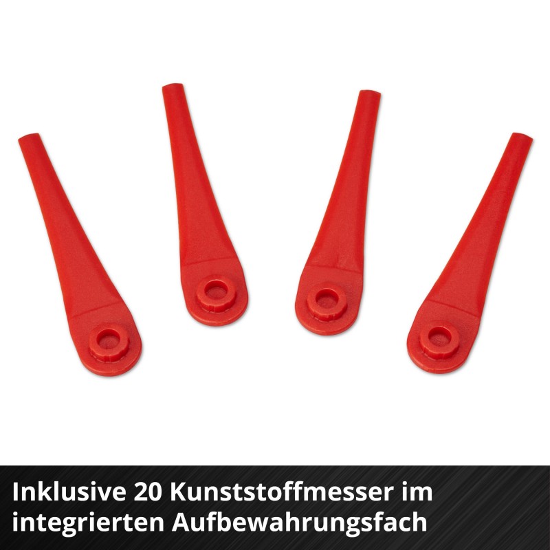 Aku trimer GE-CT 18/25 Li-Solo snažan je vrtni alat za njegu travnjaka gdje god kosilica ne može dosegnuti. Glava motora može se okretati za 180° i naginjati u 3 položaja za jednostavno održavanje travnjaka čak i na teško dostupnim mjestima vrta. Funkcija rezanja rubova znači da se čak i rubovi travnjaka mogu precizno obrezati. Zaštita za cvijeće drži alat na odgovarajućoj sigurnoj udaljenosti od cvijeća i ukrasnog bilja. Aku trimer može se koristiti ne samo s oštricama, već i s koncem ako je ugrađen odgovarajući pribor, koji se prodaje zasebno. Poseban dizajn znači da se način rezanja može promijeniti u samo nekoliko koraka zamjenom glave oštrice za glavu s koncem zajedno s kalem. Zahvaljujući beskonačno teleskopskoj aluminijskoj vodilici i podesivoj dodatnoj ručki, trimer za travu može se prilagoditi visini svakog korisnika za udobno rukovanje. Dodatna ručka ima integrirani praktični pretinac za pohranu do 20 plastičnih oštrica, koje su također uključene u set.