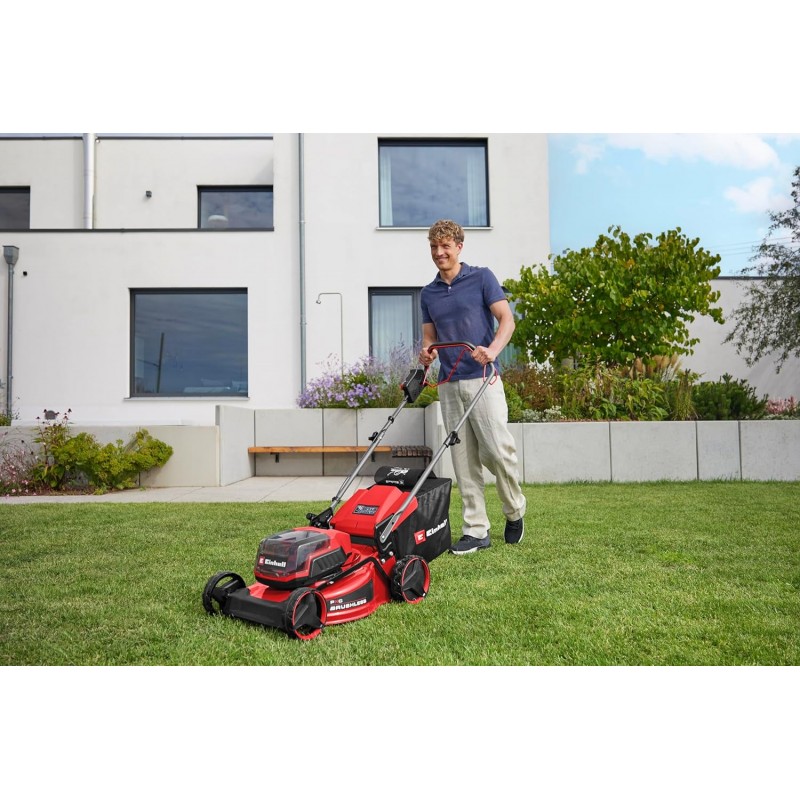Za dobro održavane travnjake oko kuće, Einhell akumulatorska kosilica GC-CM 36/46 S Li BL (2x4,0 Ah) snažan je i izdržljiv pomagač. Alat pokreće Einhell motor bez četkica. Ovaj motor bez četkica pruža veću snagu i dulje vrijeme rada od konvencionalnog motora s ugljičnim četkicama. Nakon što se registrirate online, dobivate 10-godišnje jamstvo na motor bez četkica. Akumulatorska kosilica član je Einhell Power X-Change obitelji, koja omogućuje fleksibilno kombiniranje svih baterija, punjača i alata u cijelom sustavu. Snažna 36 V Twin-Pack tehnologija koristi dvije 18 V baterije istovremeno za maksimalnu snagu i dulje vrijeme rada za njegu travnjaka. Sa širinom košnje od 46 cm, kosilica je idealna za travnjake do 500 m². Zahvaljujući pogonu na kotače s promjenjivom regulacijom brzine, kosilica se može bez napora pomicati, čak i po gušćem ili neravnom terenu. Centralno podešavanje visine košnje u 9 stupnjeva omogućuje podešavanje između 25 i 80 mm. Sakupljač trave od 50 litara s ugrađenim indikatorom razine nudi dovoljan kapacitet za opsežne košnje. Vodilica s podesivom visinom, koja se može prilagoditi visini korisnika, osigurava udobnost pri radu. Vodilica se može sklopiti radi uštede prostora. Kao kosilica s visokim kotačima i velikim kotačima prilagođenim travnjaku, manevriranje je jednostavno na svakom terenu. Robusna čelična konstrukcija nudi dodatnu stabilnost i izdržljivost. Uključene su dvije baterije Power X-Change od 4,0 Ah i dvostruki punjač, tako da se obje baterije mogu istovremeno puniti.